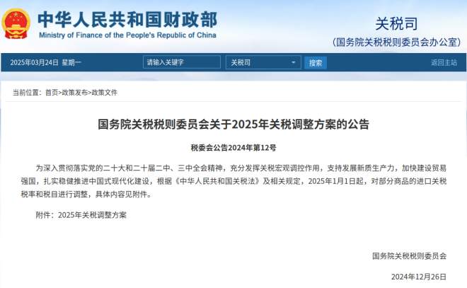 2024年12月,国务院关税税则委员会发布《2025年关税调整方案》,自2025年1月1日起调整部门商品关税税目和税率:新增乙烷等关税税目,税目总数已达8960项,意味着获得我国进出口商业专属“身份证”的商品进一步细化;对包罗环硅酸锆钠、慢病毒载体正在内的935项商品实施低于最惠国税率的进口暂定税率。上述关税调整不只是扩大国内需求、推进高程度对外的主要行动,更是财务部分“问需于企、精准施策”的活泼实践。